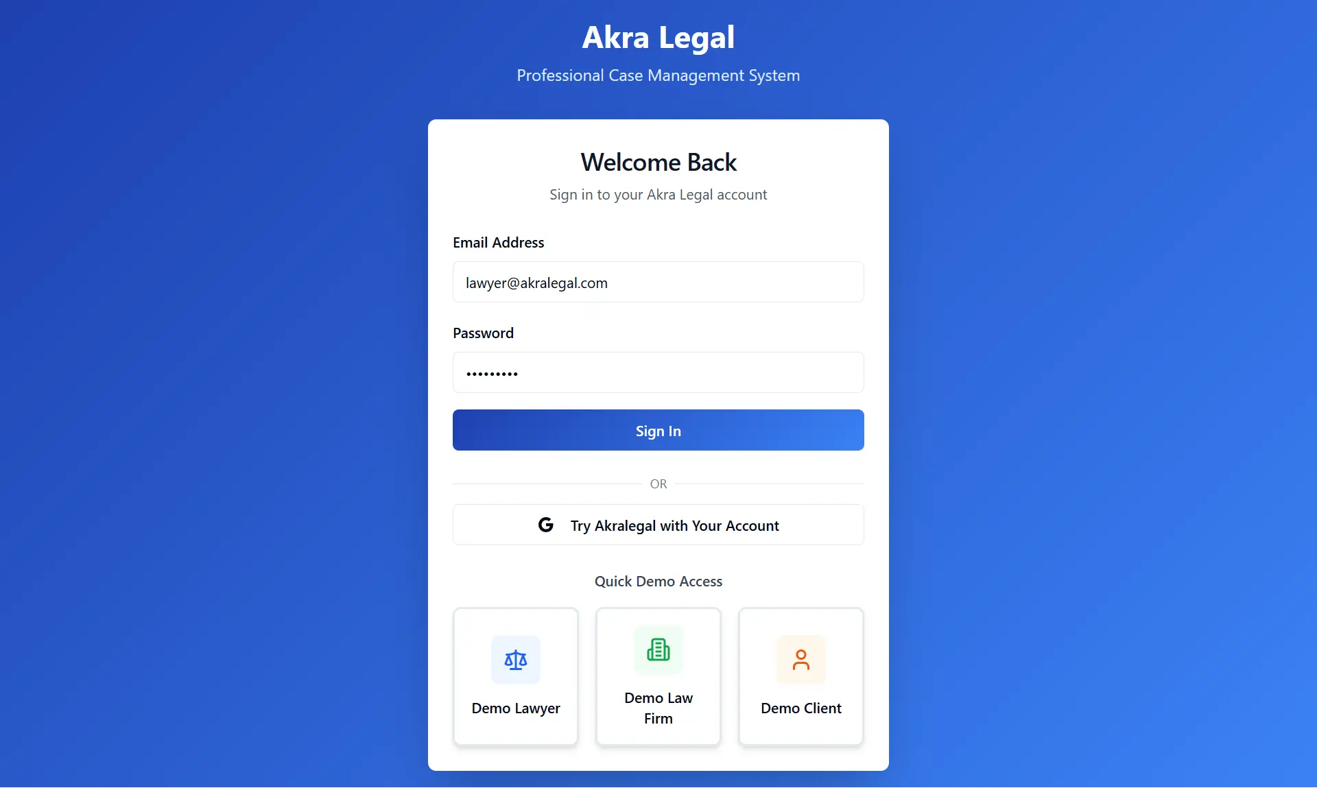 AkraLegal is a secure, AI-powered legal practice management software designed to simplify the way law firms, solo practitioners, and corporate legal teams manage their operations. From case management and compliance to document control and billing, we provide the tools that help legal professionals save time, reduce errors, and work with confidence.